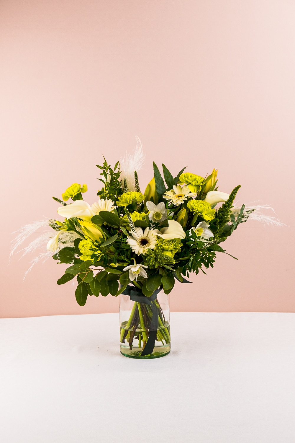 Valgetes ja rohelistes toonides kaunis lillekimp.