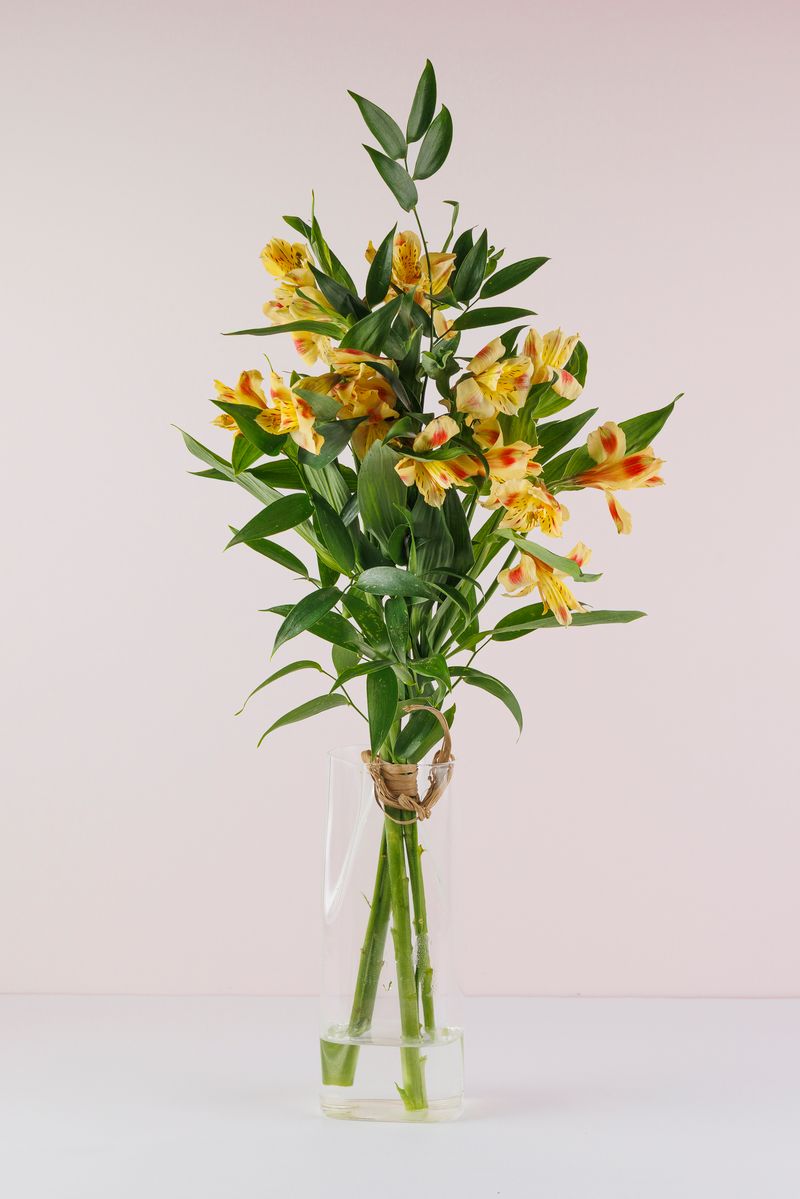 Ajatu ja kauapüsiv kimp kollaste inkaliiliate ja rohelisega.