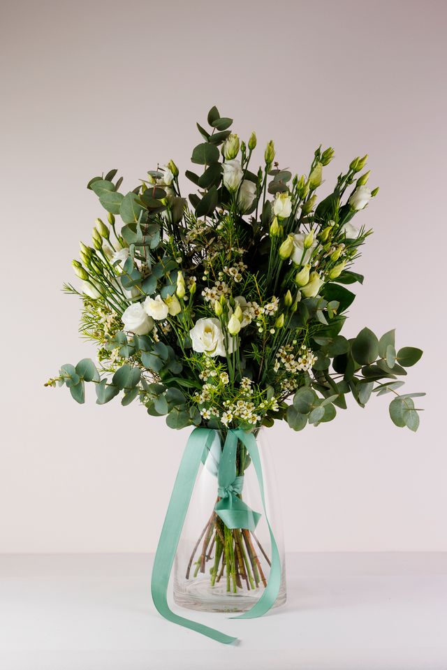 Lopsakas lillekimp valgete preeriakellade ja eukalüptiga,  mis loob hetkega rahuliku meeleolu.