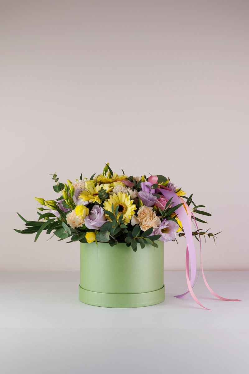 Rõõmsameelne lilleseade kollaste gerberate ja pastelsete preeriakelladega. Stiilne ja mugav kingitus, mis ei vaja vaasi. Lilleseade on tehtud märjale plastvahule, mistõttu ei vaja see vee vahetamist.