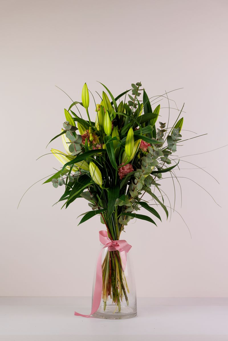 Elegantsete liiliate, õrnade roosade preeriakellade ja eukalüptiga modernne kimp. Kingitus, mille ilu avaneb järk-järgult õite puhkemisega.