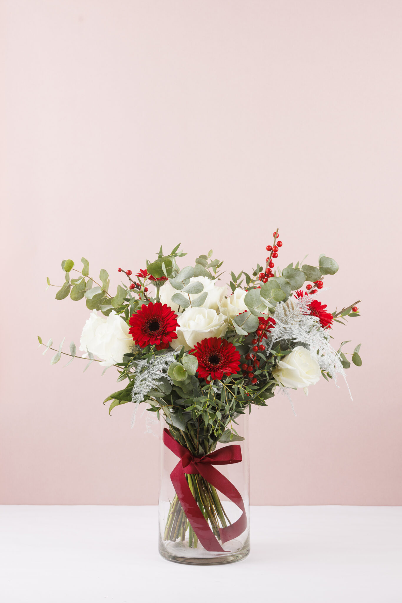 Punaste gerberate, valgete roosidega elegantne ning ajatu lillekimp.